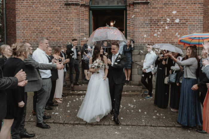 Keine Sorge, Regen am Hochzeitstag ist kein Grund zur Panik! Wir bleiben flexibel. Oft gibt es Regenpausen, die wir für ein kurzes Brautpaarshooting nutzen können, das weiche Licht bei bewölktem Himmel ist für Hochzeitsbilder oft sogar schmeichelhafter als pralle Sonne. Zudem habe ich immer transparente Schirme dabei, die auf den Bildern richtig romantisch aussehen, oder wir weichen für die Paarfotos auf eine schöne Indoor-Location aus.
